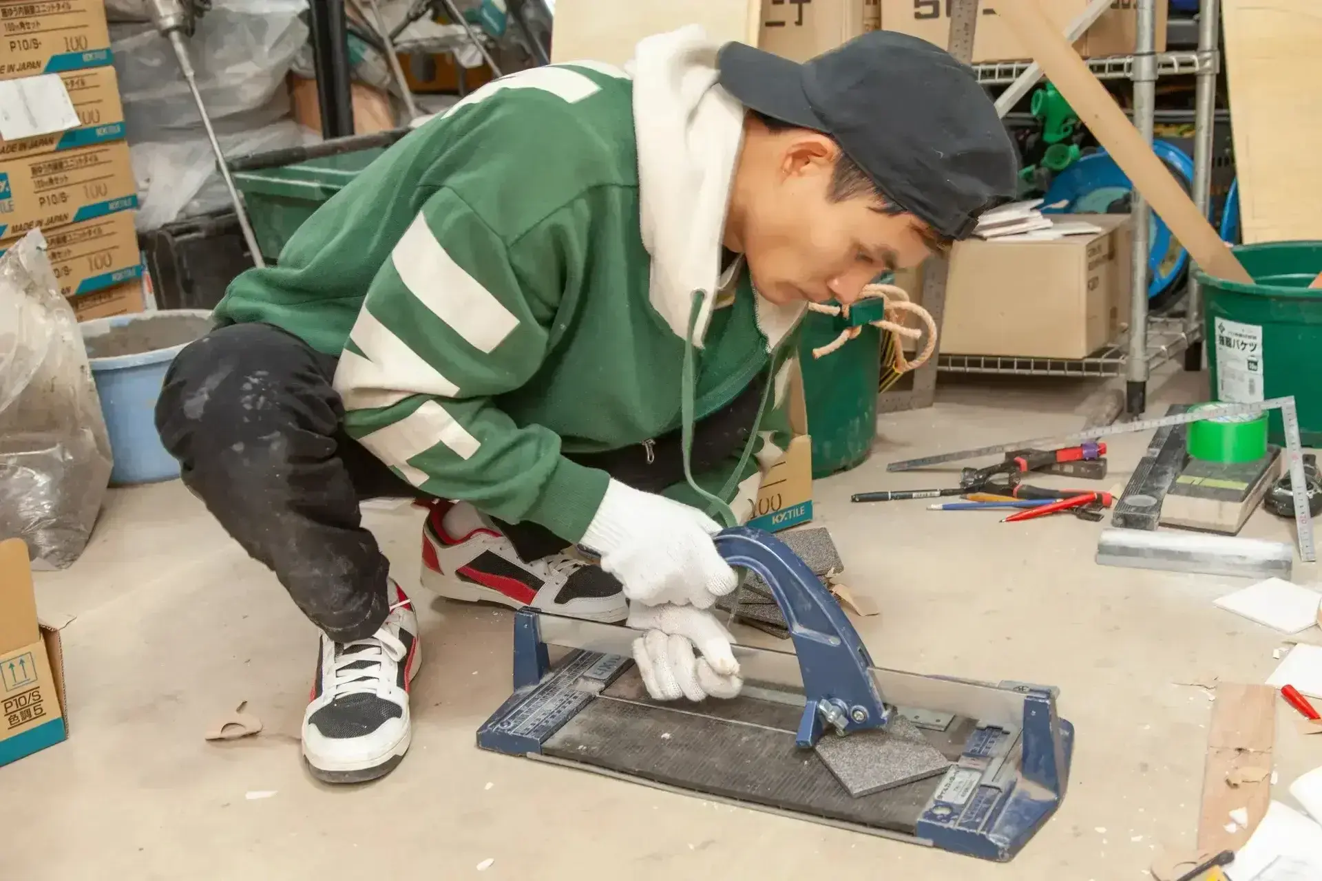 チームで作業を分担し、図面を確認しながらタイル張りなどに取り組みます。